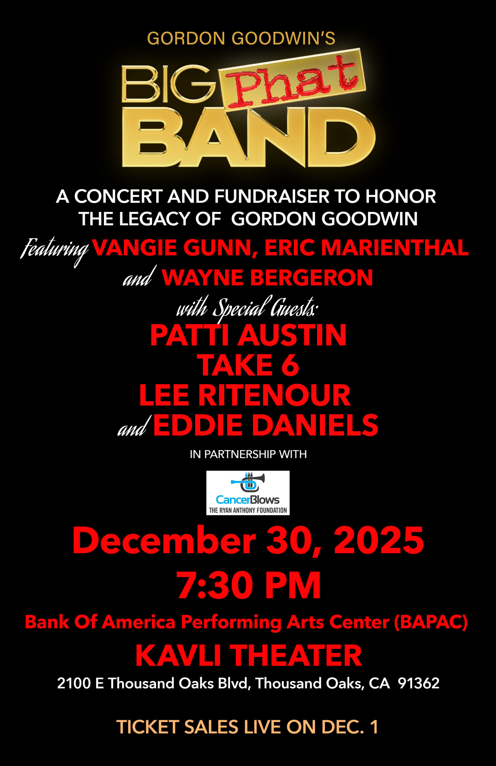 Join the Big Phat Band, Take Six, Lee Ritenour, Wayne Bergeron and more on December 30th as we honor the life and musical legacy of jazz pianist, saxophonist, conductor, arranger and composer Gordon Goodwin who we lost this month to pancreatic cancer. A portion of the proceeds from this amazing night of music will benefit CancerBlows.