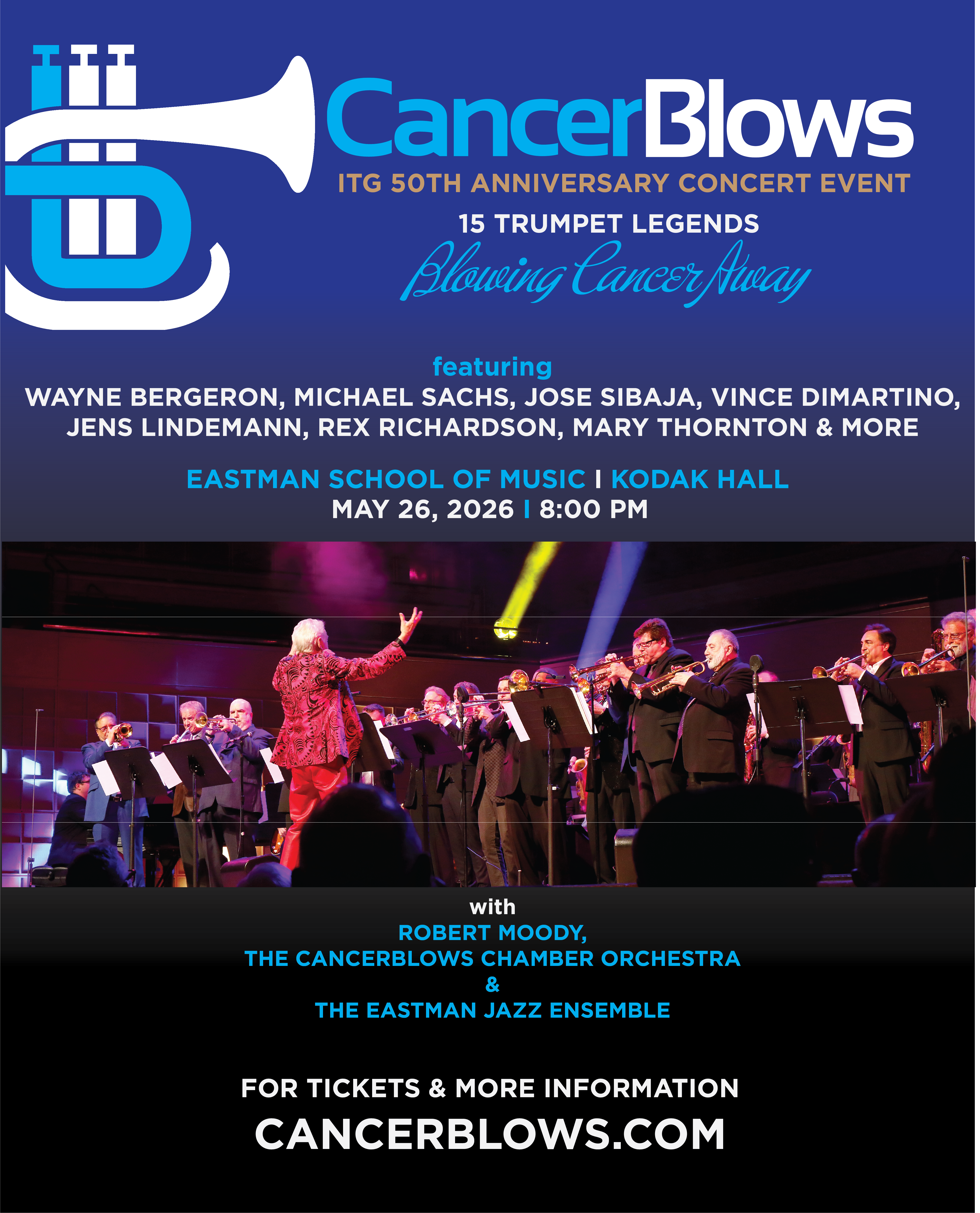 CancerBlows is proud to help celebrate the International Trumpet Guild Conference’s 50th anniversary with a thrilling concert to start this year’s conference. Concert tickets are included with ITG Conference attendance. However, if you can’t attend the conference, you can still come to the show. A limited number of general public tickets are available through the link below.
